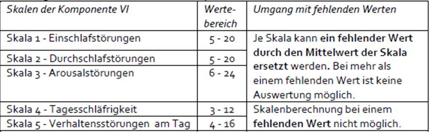 Die Komponente VI bildet Symptome und Folgen der Schlafstörungen auf fünf Skalen ab: